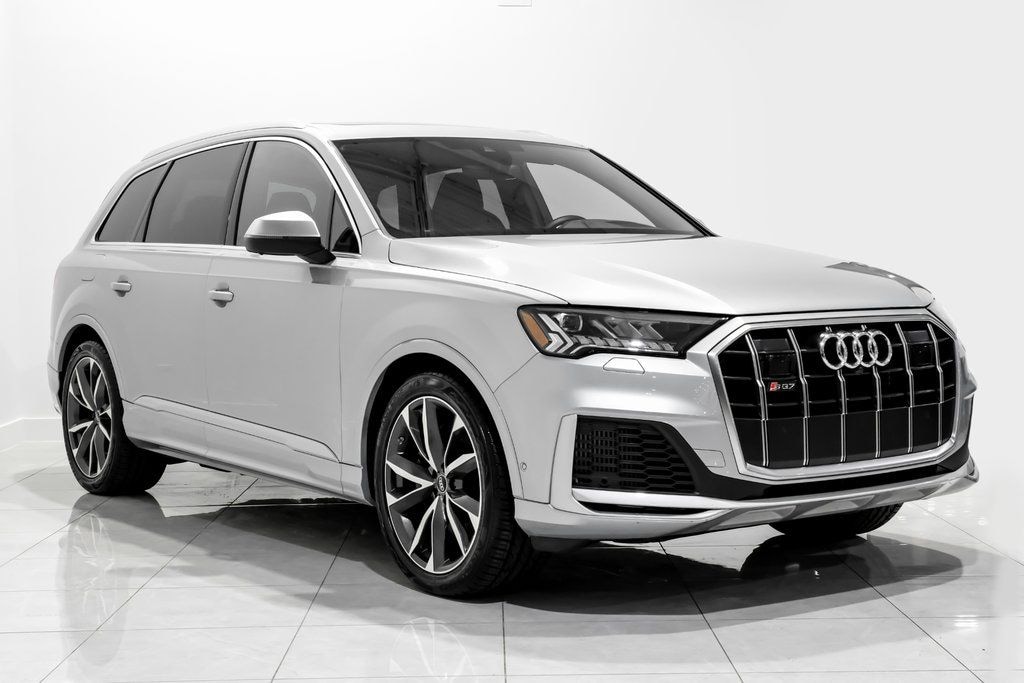 CARFAX One-Owner. Satellite Silver Metallic 2024 Audi SQ7 Prestige quattro quattro 8-Speed Automatic with Tiptronic 4.0L V8 Turbocharged DOHC 32V LEV3-ULEV125 500hp Dual-Pane Acoustic Glass for Side Windows, Executive Package, Head-Up Display, Heated Rear Seats, Intersection Assist, Power Soft-Closing Doors, Prestige Package, Rear Door/Side Windows & Tailgate Sunshades, Remote Park Assist Plus, Traffic Sign Recognition, Ventilated Front Seats.